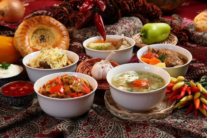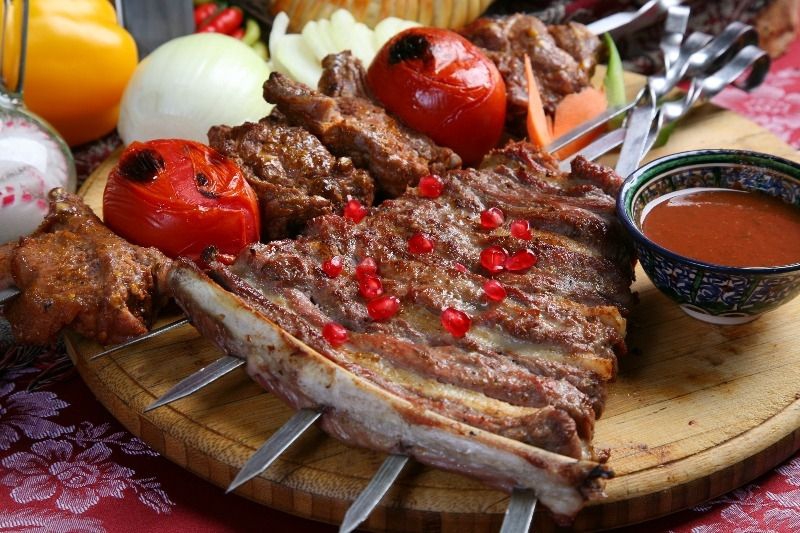 El menú, demasiado extenso para detallar, es muy definitoria de la gastronomía uzbeka al tiempo que reconoce el hecho de que estamos en Kazajistán, una nación multiétnica que tiene muchos tipos de cocina local. Las opciones populares incluyen los platos de barbacoa y el cordero asado al horno que los reyes de las estepas solían comer. Luego hay más de diez tipos diferentes de shashliks sin los cuales muchas personas consideran incompleta la comida de Asia Central. El famoso caldo sorpa, también cocinado con cordero, también es una delicia obligada, mientras que se dice que los samsas valen el viaje por sí mismos. Probablemente ocupando un lugar destacado en el menú están los platos de tandyr (horno) que incluyen tortillas y plov (arroz), especialmente el famoso plov de bodas y el plov regional de Fergana.