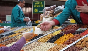 Fra erfaring vet vi at midten av Det Grønne Bazaaren er et flott sted å tilfredsstille gastronomiske ønsker. Paviljonger linjer gårdsplassene, og gir et uendelig utvalg av frukt, grønnsaker, meieriprodukter, tradisjonell kasakhisk mat og drikke, deilige kjøtt-, fiske-delicatesser, hjemmelagde oster og koreanske salater. En stor del av matområdet er dedikert til prøvetørking av frukt boder. Markedet bringer fersk kaviar fra Kaspihavet, samt medisinske varianter av honning, inkludert de fra nabolandet Kirgisistan.