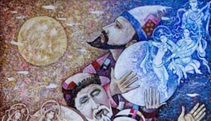 Det er ikke indiske motiver. Dette er uigurene fra buddhisttiden. Vår nasjon er veldig gammel, i løpet av historien har den også tatt til seg religionene kristendommen og islam. Siden buddhismen, 5 - 6. århundre e.Kr., har vi bevart mange arkitektoniske monumenter, inkludert veggmaalinger i de tusen buddhas' huler. Jeg forsket på 1,5 tusenår gamle teknikker for veggmaalinger i disse hulene. Buddhistiske motiver i maleriene mine er en hyllest til de gamle mestrenes kreativitet. Forfedrenes komposisjoner har jeg ført gjennom prismet av min nåtidige bevissthet og skapende stil.
